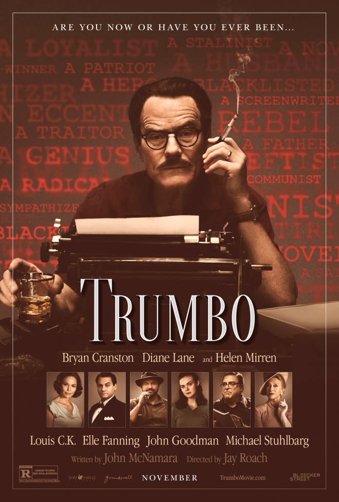 The successful career of 1940s screenwriter Dalton Trumbo (Bryan Cranston) comes to a crushing end when he and other Hollywood figures are blacklisted for their political beliefs. TRUMBO (directed by Jay Roach) tells the story of his fight against the U.S. government and studio bosses in a war over words and freedom, which entangled everyone in Hollywood from Hedda Hopper (Helen Mirren) and John Wayne to Kirk Douglas and Otto Preminger.
