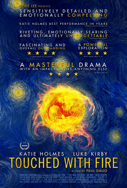 I give TOUCHED WITH FIRE a rating of: WAIT AND CATCH THIS ONE ON NETFLIX or STREAMING: This film is a valiant attempt by Dalio to bring to light the plight of those suffering with bipolar disorder, and for that, he should be commended. Holmes is convincing as the young woman struggling with her illness, and her longing to live a NORMAL LIFE, and Kirby is entertaining too, as the man drawn to the moon, and the love and affection of his new found love ~ well at least when he is in the manic state of his disease. But, even with these positives in place, I found this film to take a very passive approach to the world of those living with bi-polar disorder ~ from the basically simple meeting of these characters in the hospital, to their cut and funny little escapades escaping from their parents, and the hospital staff, to their lives living together, much to their parents dismay ~ the whole storyline just seemed to be understated without any REAL DRAMA taking shape, which I am sure is not THE REAL STORY when it comes to living with this disease, or seeing a family member or friend struggling to keep it together, day, after day, after day, which leaves me to suggest that you catch TOUCHED WITH FIRE in the luxury of your own home, a few months from now…