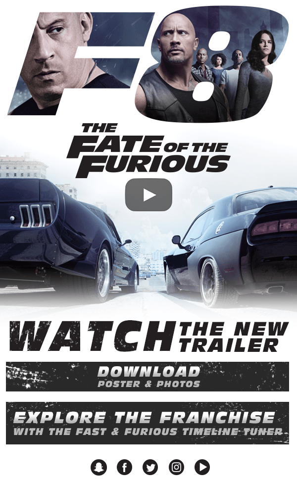 The new trailer for THE FATE OF THE FURIOUS has just debuted online. Watch and share using the embed below, plus explore the franchise with the Fast & Furious Timeline Tuner.